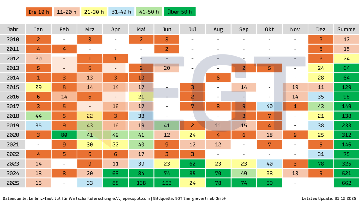 Wie sich die Anzahl an Stunden, die es zum Nulltarif oder sogar zu negativen Preise gibt, in den letzten Monaten und Jahren entwickelt hat, entnehmen Sie der obigen Heatmap.